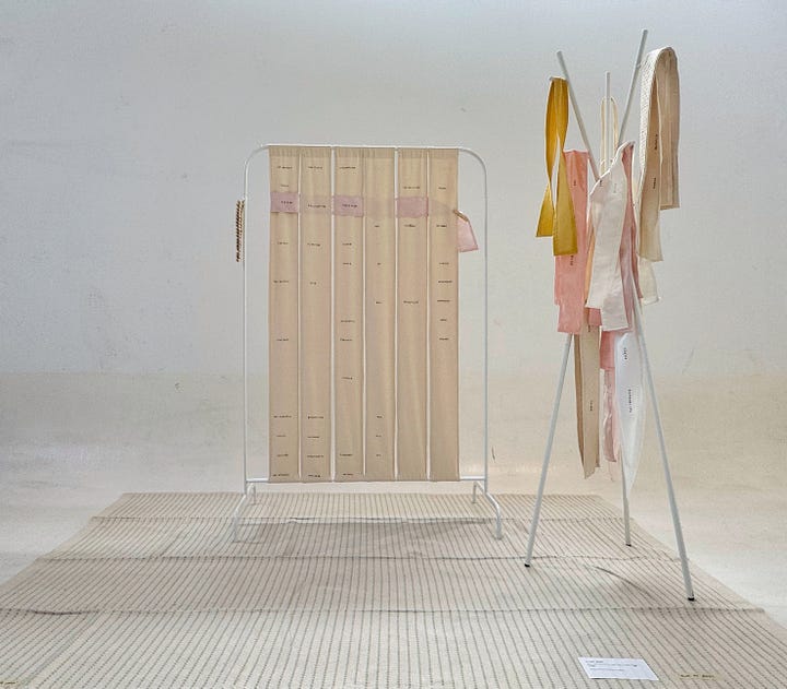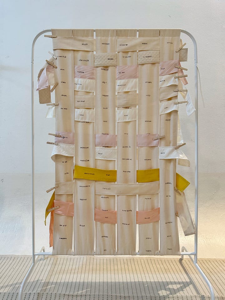Whilst preparing this woven poem piece with my collaborators for exhibition (in the short span of four days), we found ourselves up at 6am on the last night. All throughout the night as we were painstakingly stamping individual letters to make words on fabric we joked about how earnest we all were for the way we were undertaking this project so seriously. By midnight the proposition was to only stamp one side for the sake of time, but in all of us there was quiet yearning to keep stamping, to fill out the vision, to believe that we could do it all. You could feel the unhinged resolve in the air. There is perfectionism, there is fear, but also a feeling of painful earnestness, to this piece, and to this paper I tried to write, trying to do justice to the writers who trusted me with their processes, but also to the potential harms. There are things that are done for fun, and things that make me quiver.